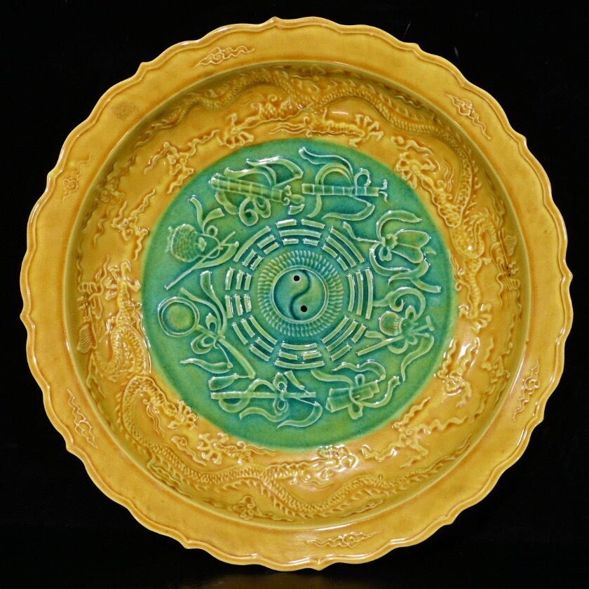 - 蔵友旧蔵出 明 弘治年製款 黄釉 開片 綠釉 八寶紋 八卦供盤 稀少珍品 貴重品 古陶瓷品 置物 古賞物 中国古玩 中国古美術品