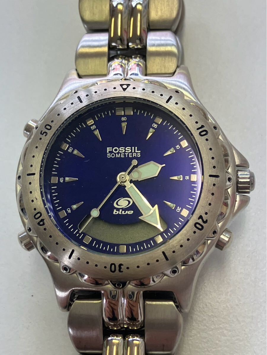 - 【中古品】FOSSILフォッシル blueブルー 50METER 腕時計 AM-3244 クオーツ シルバー ステンレス 青文字盤 ダイバー時計 現状品