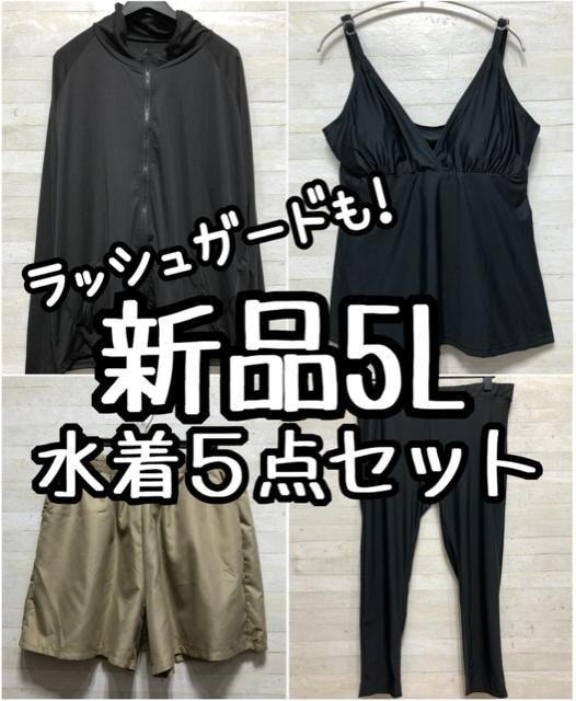 - 新品☆5L♪黒系♪黒ラッシュガード・レギンス付♪水着5点セット♪UV☆G792