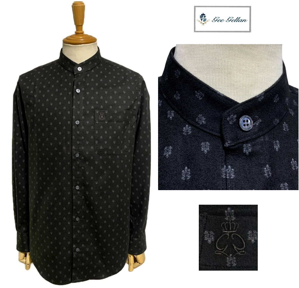 > GEE GELLAN ジーゲラン GEEGELLAN ポケット刺しゅう 小柄織柄 綿ネル スタンドカラーシャツ 黒 size46 M