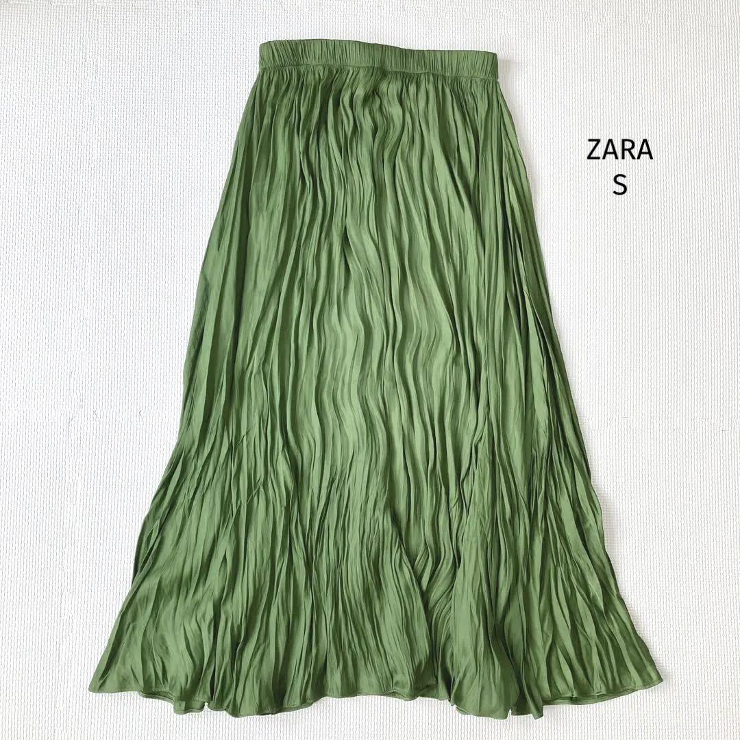 - ザラ ZARA ロングスカート【S】カーキ 光沢 サテン風 プリーツ 総ゴム