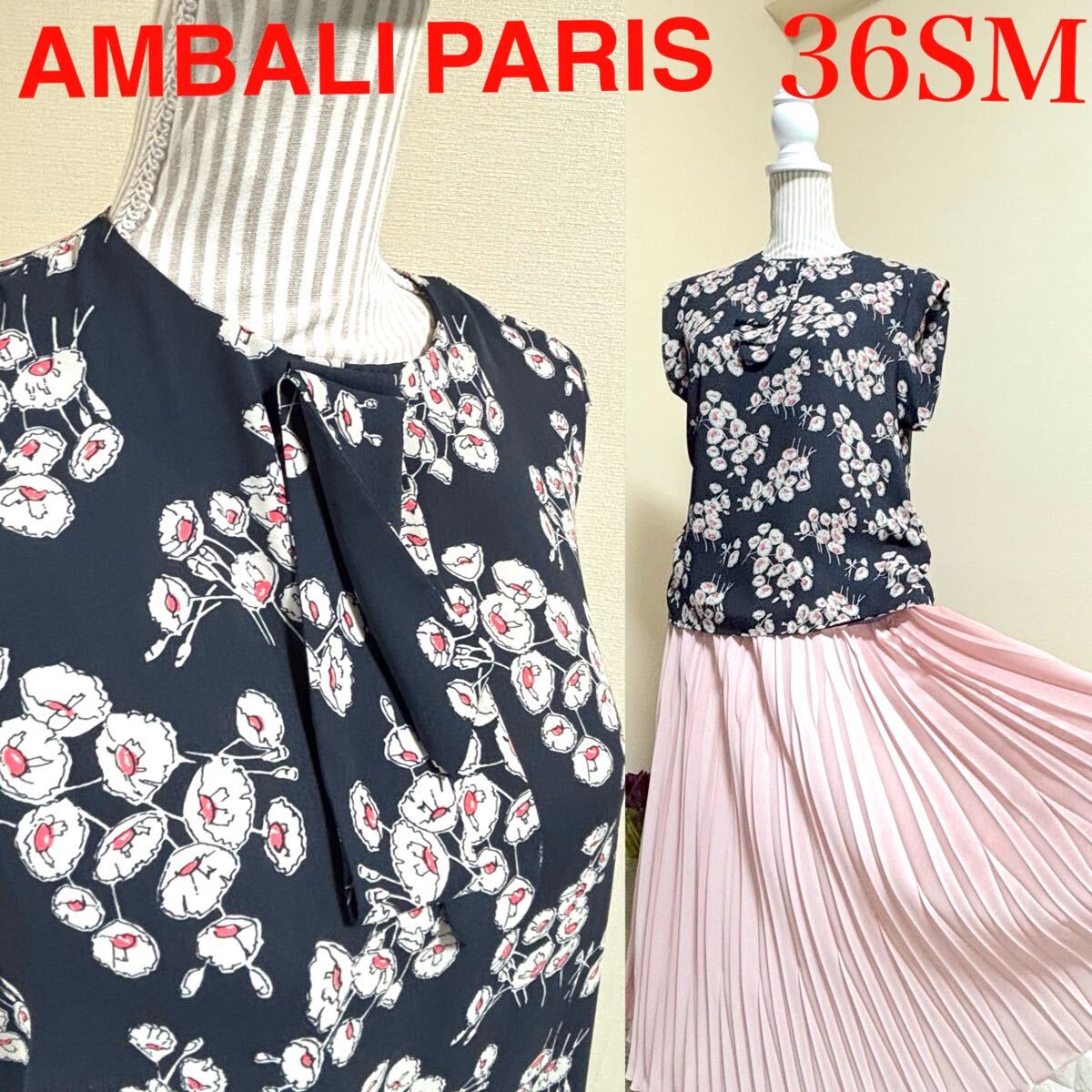 - 美品!AMBALI アンバリ 高級 タイ付 フラワー ブラウス 36 M 濃紺 プルオーバー 花柄 日本製