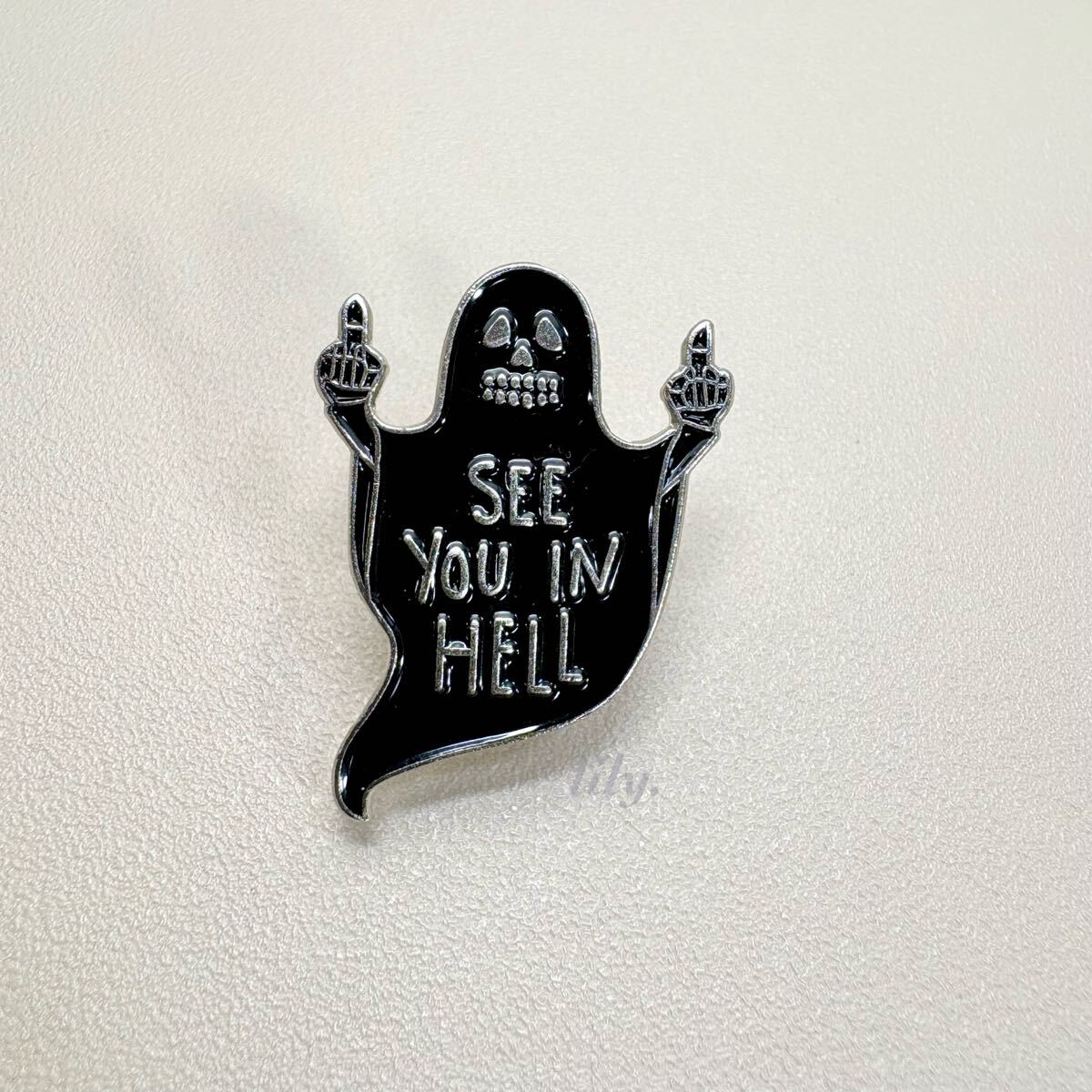 - 【ピンバッジ】黒いゴースト おばけ SEE YOU IN HELL 英詩
