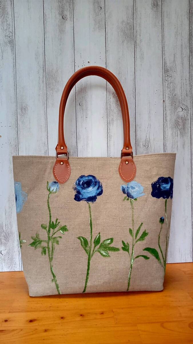 > ★★送料無料★フランスリネンSTOF社★ラナンキュラスのしっかりトート★ファスナーポケット付き★レザーの持ち手・肩掛けタイプ★底板付き
