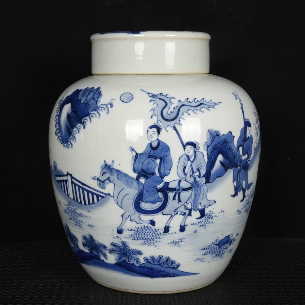 > 『館蔵珍品 清 康熙年製款 古陶瓷品 青花 走馬上任人物故事紋 蓋罐 陶藝』稀少珍蔵品 古賞物 貴重物品 収蔵品 中国古美術 時代物 古董品