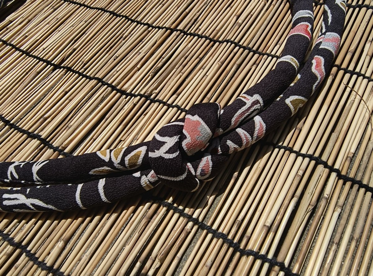 ■正絹・アンティーク・古縮緬、黒に楽しいカラフル型染め 手作りの丸ぐけ帯締めです。