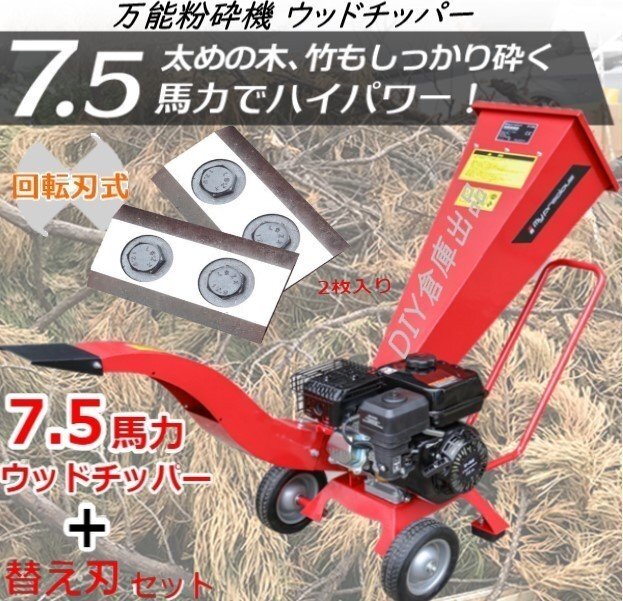 - 【お得セット】エンジン粉砕機 ウッドチッパー +【替え刃2枚セット】◆7.5馬力◆最大処理径70mm 竹・樹木 農業 日本語説明書