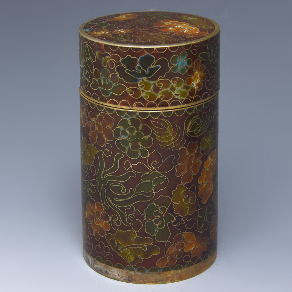 - 中国七宝 景泰藍 琺瑯彩 菊花文 筒型 茶心壷 茶入 蓋物 銅製 七宝 古玩 唐物 u0425o