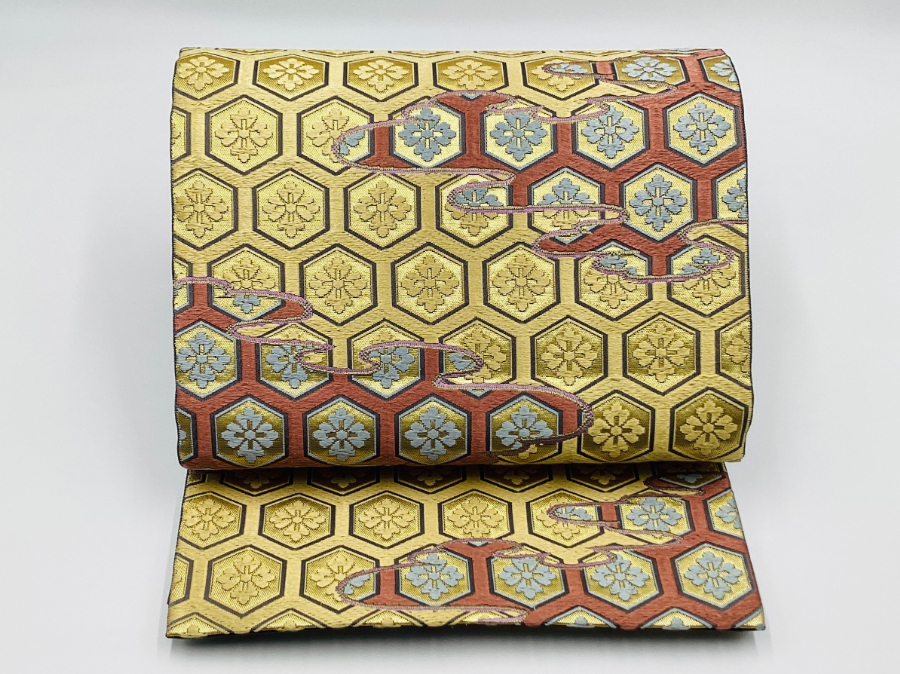 - 未使用品 正絹 袋帯 引箔 唐織 山口美術織物 雲取亀甲文様 六通柄 O25081 t