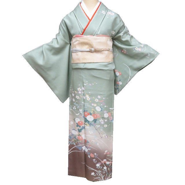 - 訪問着 着物 中古 正絹 袷 フォーマル 花模様 秋草 春秋 浅緑色 多色 身丈159cm 裄68cm M きもの北條 A1214-8
