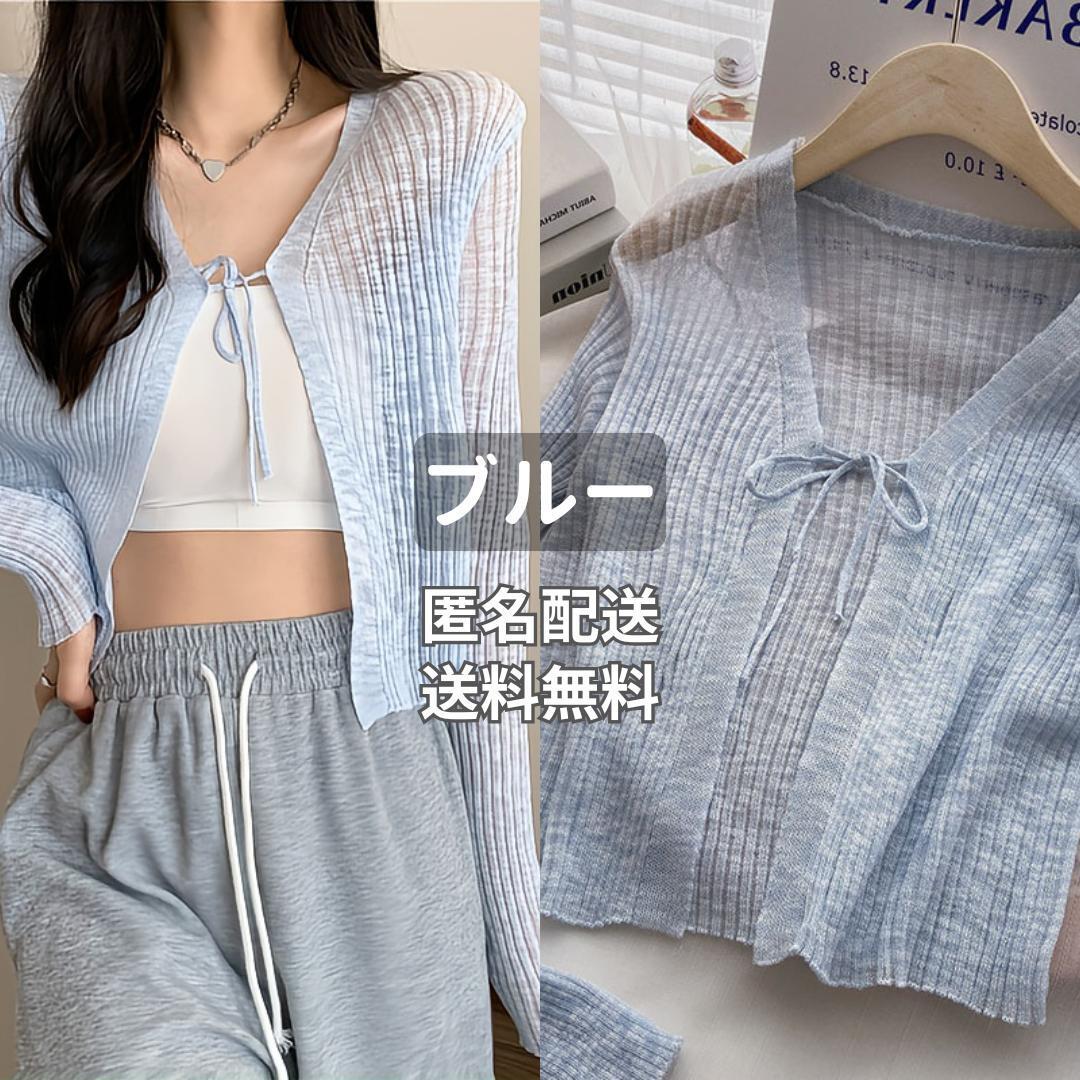 - レディース 韓国ファッション シアーカーディガン ショート丈 透け感 ブルー レディース トップス おしゃれ