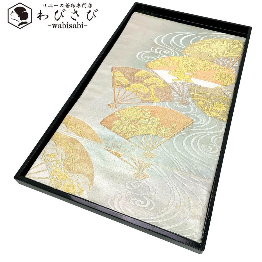 - 袋帯 琳派流水扇文 扇子に流水模様 金銀糸 白緑色 O-3892 着物 きもの kimono 和服 和装 中古 リサイクル着物 【送料無料】