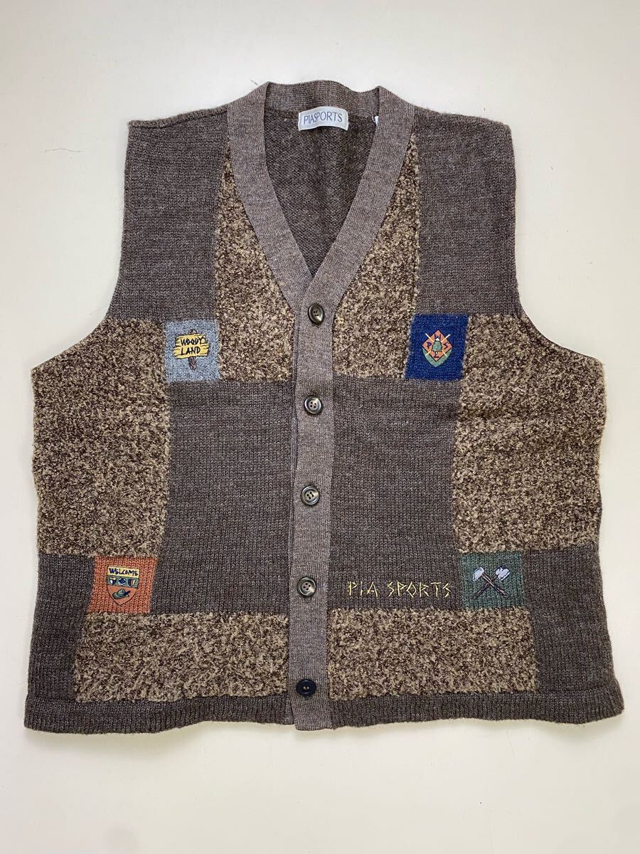 - ★ ヴィンテージ PIA SPORTS パッチワーク ニット ベスト ブラウン サイズ4 (L~LL相当) ◆ ウール混 ジレ ピアスポーツ ◆W28 さCTI8-12