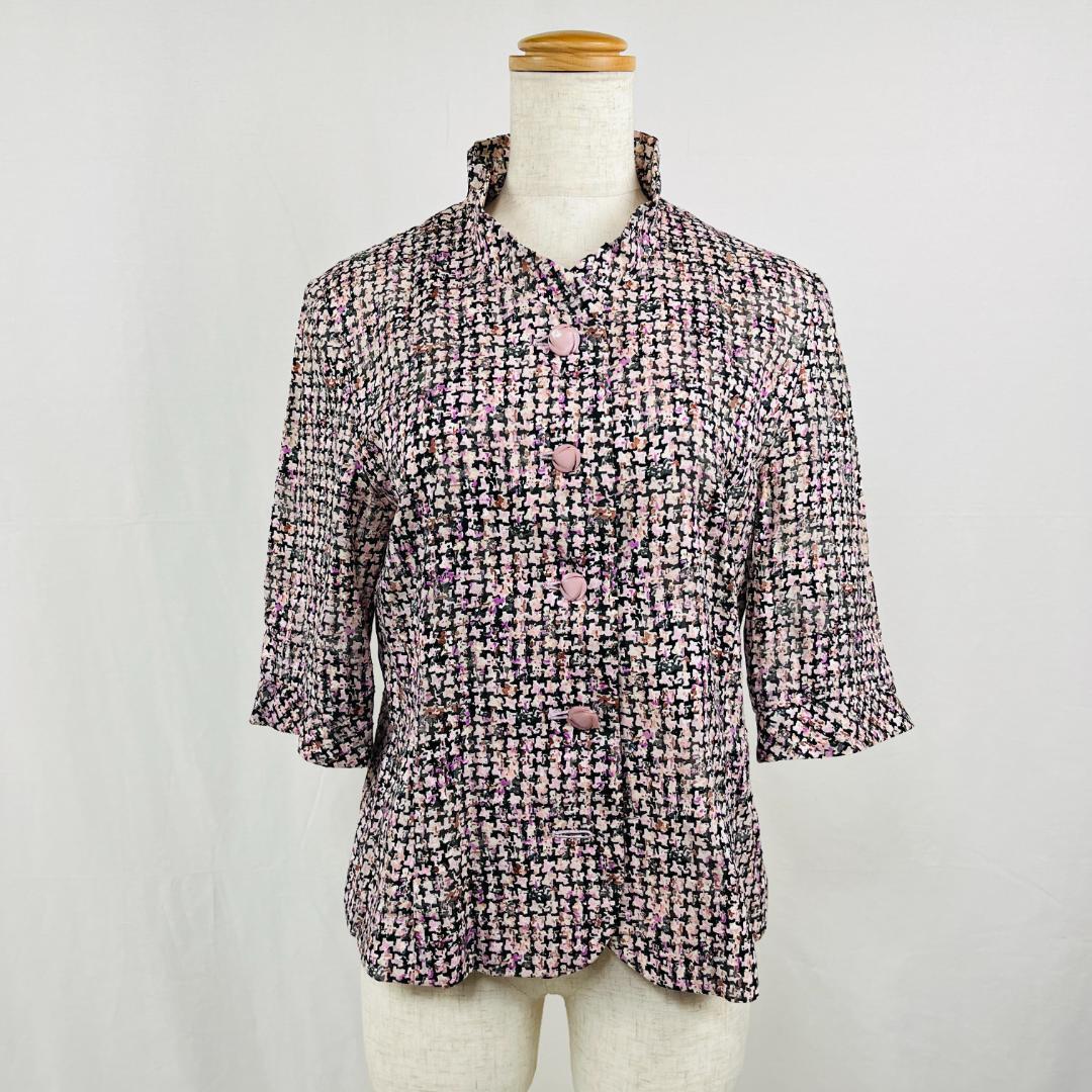 - 【2202】ALTAMODE 9ABR ピンク 5分袖トップス 昭和レトロ 袖フリル シアートップス モザイク柄 バンドカラー 日本製 フェミニン