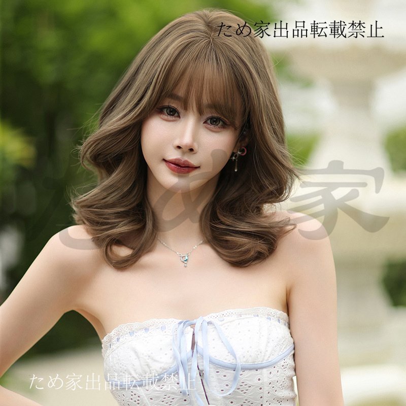- 新品人毛 ロングカールウィッグ 大きめウェーブ ミストブラウン 自然な質感 小顔効果 つむじ部分手植え 自然に見えますフルウィッグ