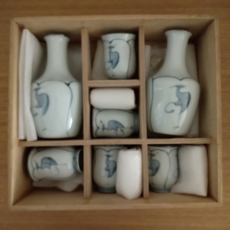 > 有田焼 慶四郎窯 酒器揃 徳利2御猪口5 箱なし 手描き ぐい呑み 箱あり(蓋なし) サギ 鷺 鶴 ツル