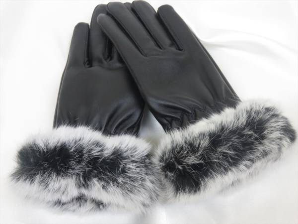 - 送料無料 レディース ラビットファー付き レザー手袋 裏起毛 黒