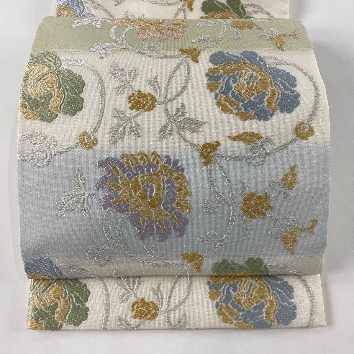 - 【在庫一掃】 袋帯 逸品 洛陽織物 落款 牡丹唐草 段縞模様 唐織 金銀糸 クリーム 六通 正絹 【中古】
