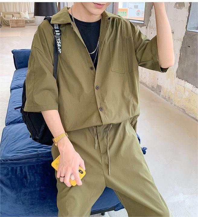 - オーバーオール オールインワン メンズ つなぎ ツナギ おしゃれ 無地 折襟 5分丈 カーゴつなぎ ダークグリーン M