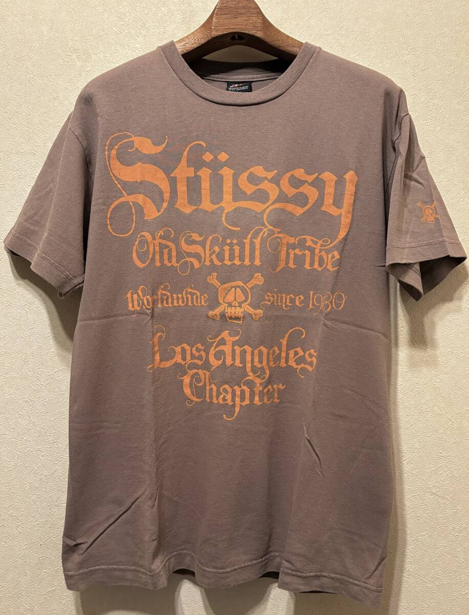 > 00sオールドstussyオールドイングリッシュTシャツM茶MEXICO/USA製コットンy2kスカルボーンLos Angelesバック袖プリント年代2000sビンテージ
