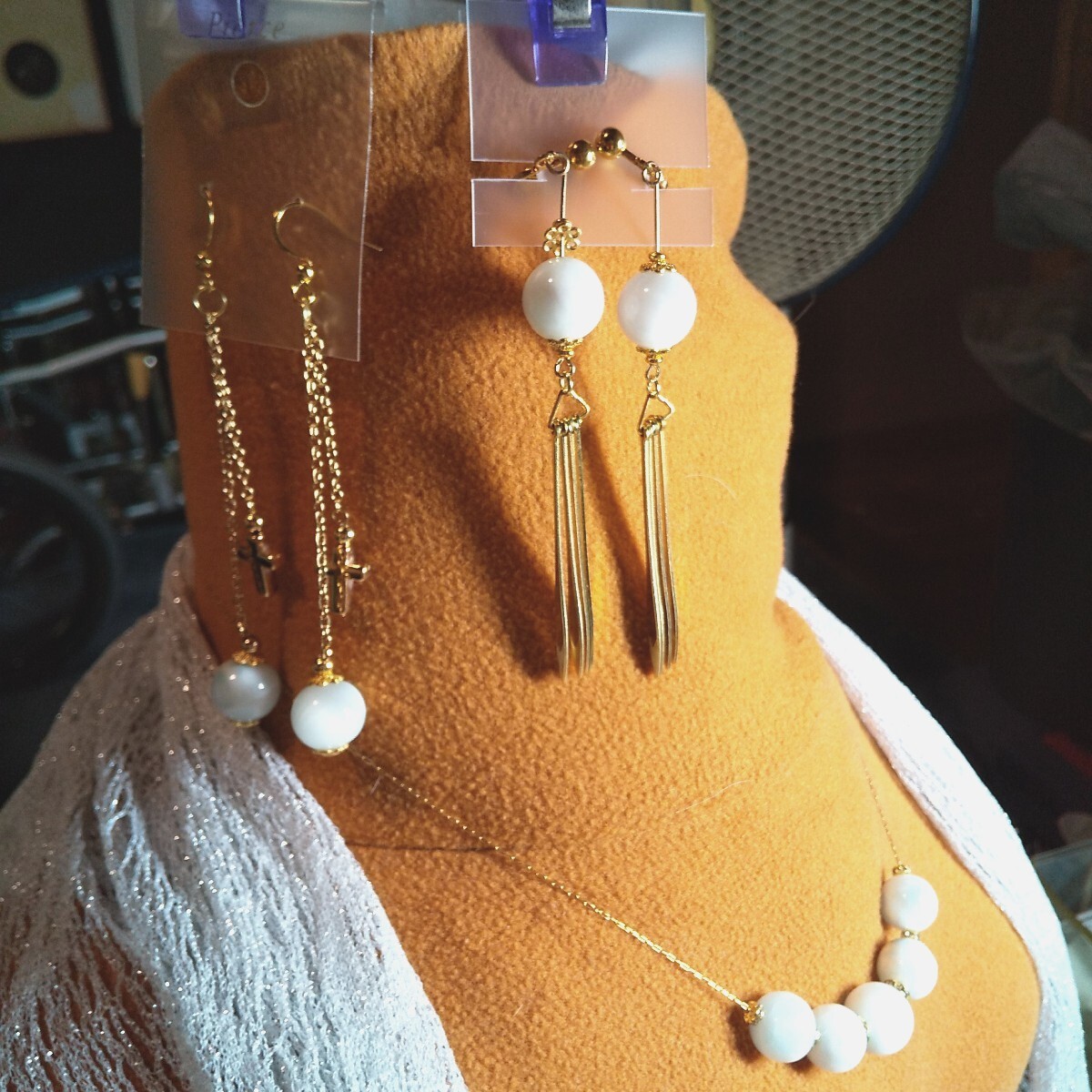 > 天然石ホワイトラリマー(アイスラリマー)大粒サイズ 貫通金色ネックレス+選べる耳飾【平和 安らぎ 無条件の愛 束縛からの解放】ブリコラ屋