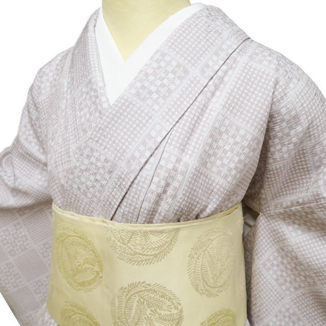 > 小紋 着物 中古 正絹 袷 カジュアル 市松取り 格子模様 絹鼠色 胡桃染色 身丈164cm 裄65cm L きもの北條 A1221-5