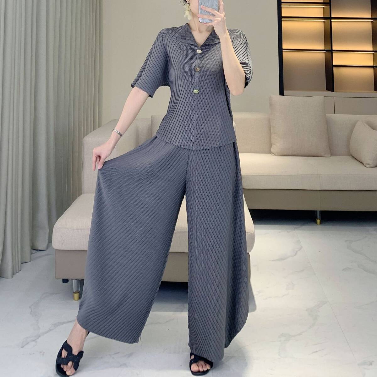 - 同梱1万円送料無料レディースプリーツpleats半袖シャツブラウスパンツ2点セット肌触り弾力ドレー プ性がいいポケットありポケット グレー