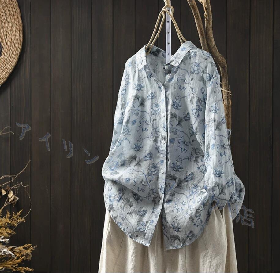 - 新品★シャツ レディース 花柄 長袖 ブラウス 折り襟 長袖 シャツブラウス プリント トップス 前開き 綿麻 ブルー