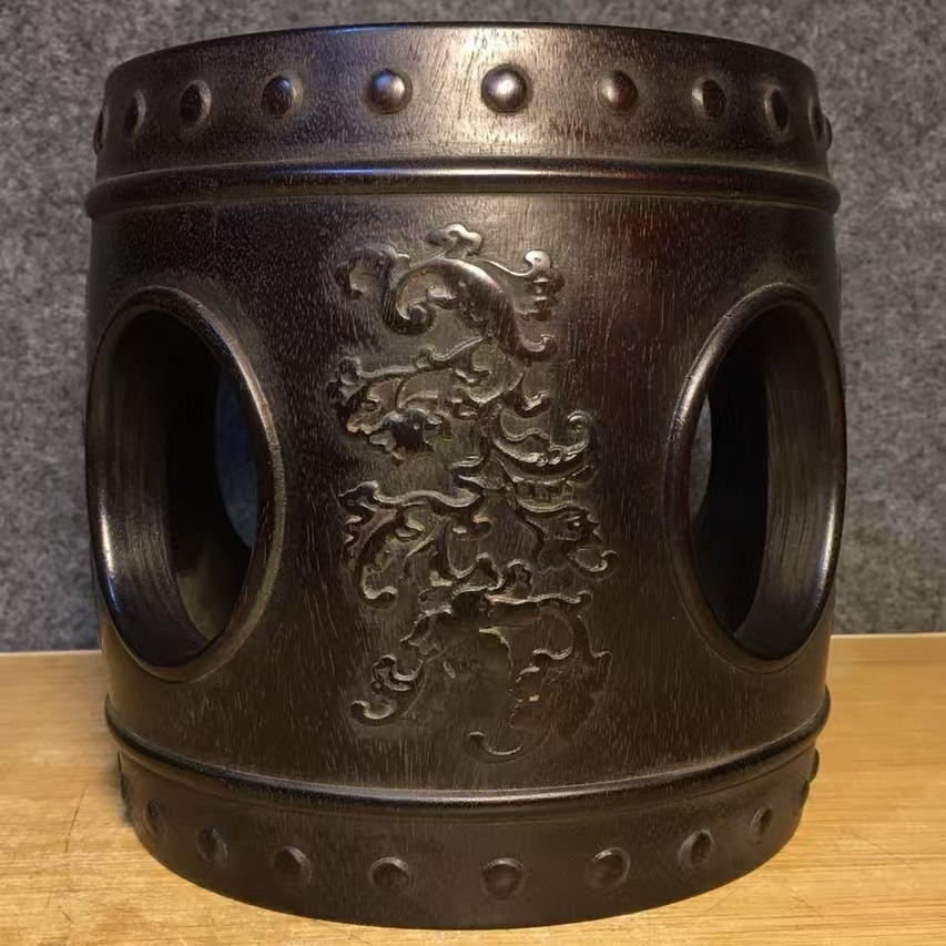 - 古木彫りの筆立て 秘藏 清代 古代紫檀彫刻花紋筆立て 書道具 文房具 時代物 中国古美術 細密彫 置物 賞物 唐物 木彫り 文玩 6.5