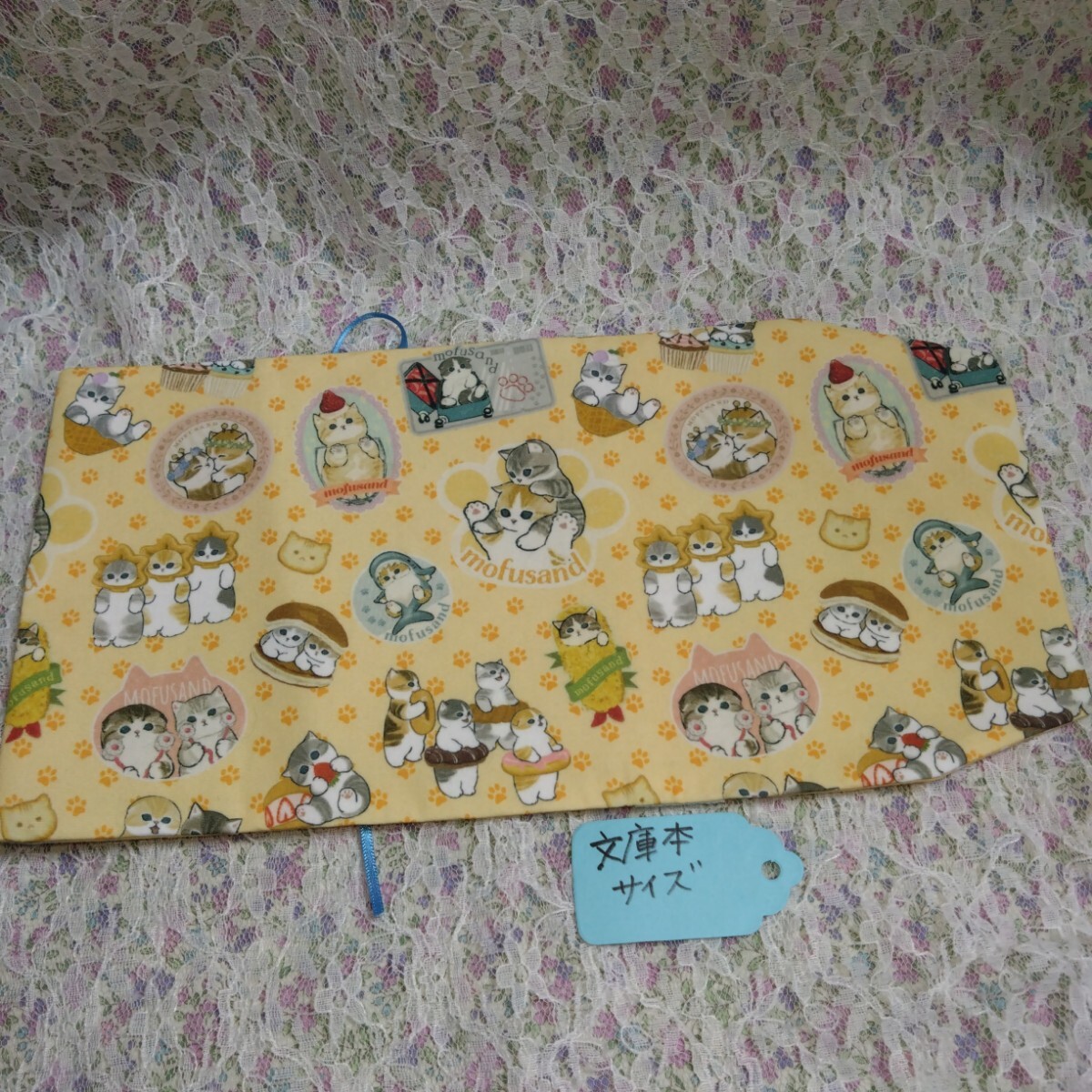 > 文庫本sizeブックカバー 猫柄 黄色 ハンドメイド シーチング モフサンド風