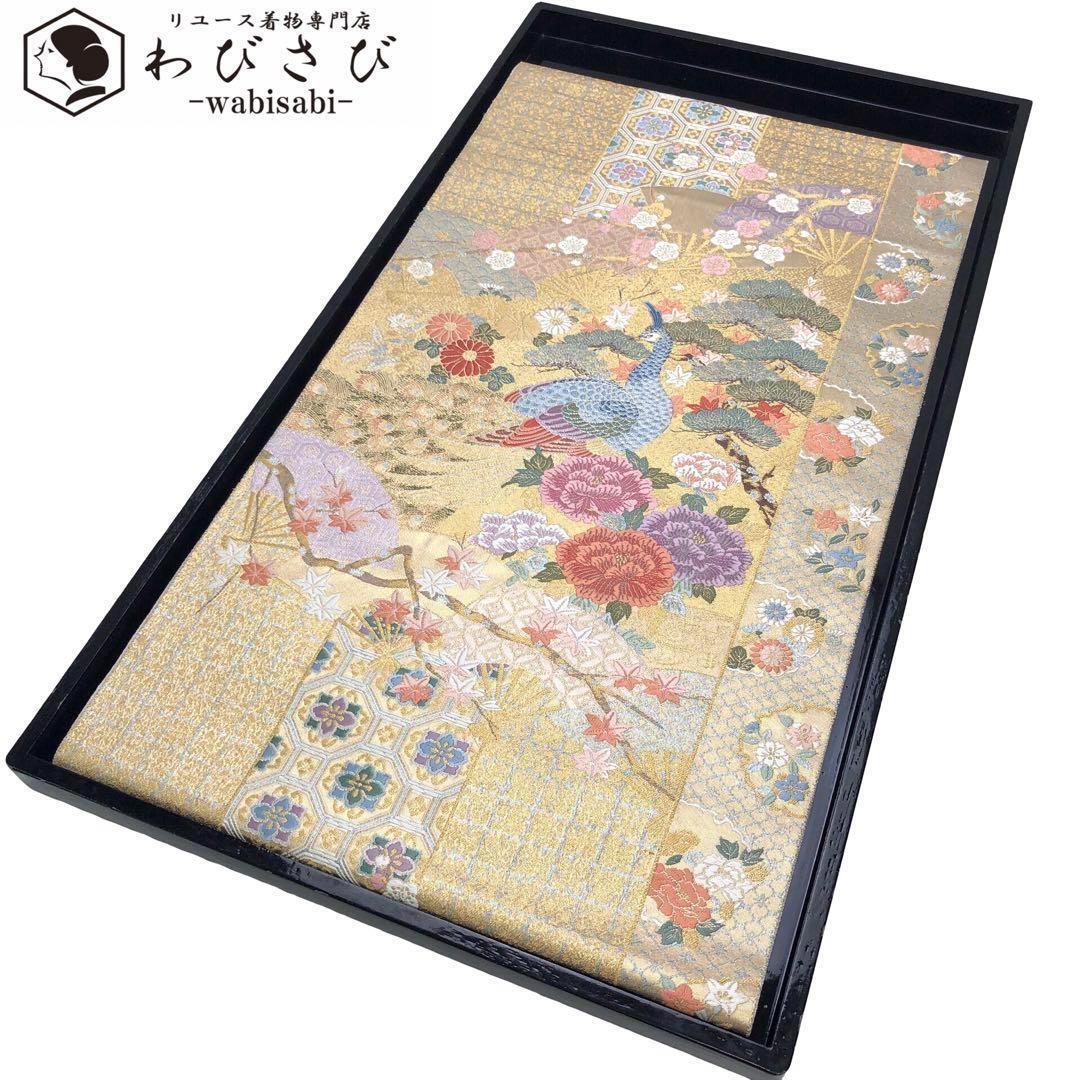 > 袋帯 本金箔 献上王華孔雀文 扇子 松 牡丹 金色 O-2926 着物 きもの kimono 和服 和装 中古 リサイクル着物 【送料無料】