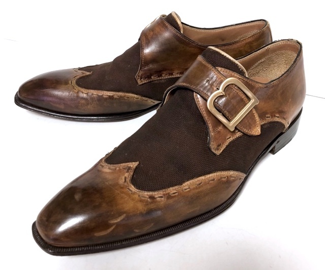 > ☆二点落札で送料無料!2A42【オーダーカラー】ステファノブランキーニ 切替レザー ドレスシューズ 7.5 ブラウン系 モンクストラップ 伊製
