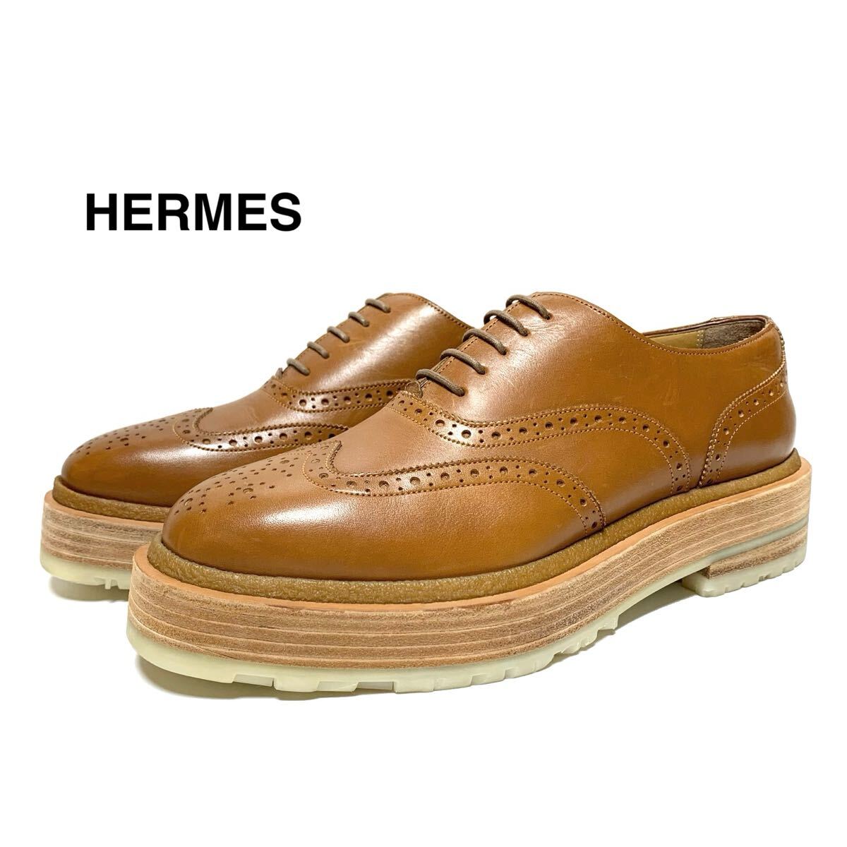 > ☆良品 HERMES エルメス 厚底 レザー フルブローグ ドレスシューズ size 36.5 イタリア製 革靴 内羽根 オックスフォードシューズ