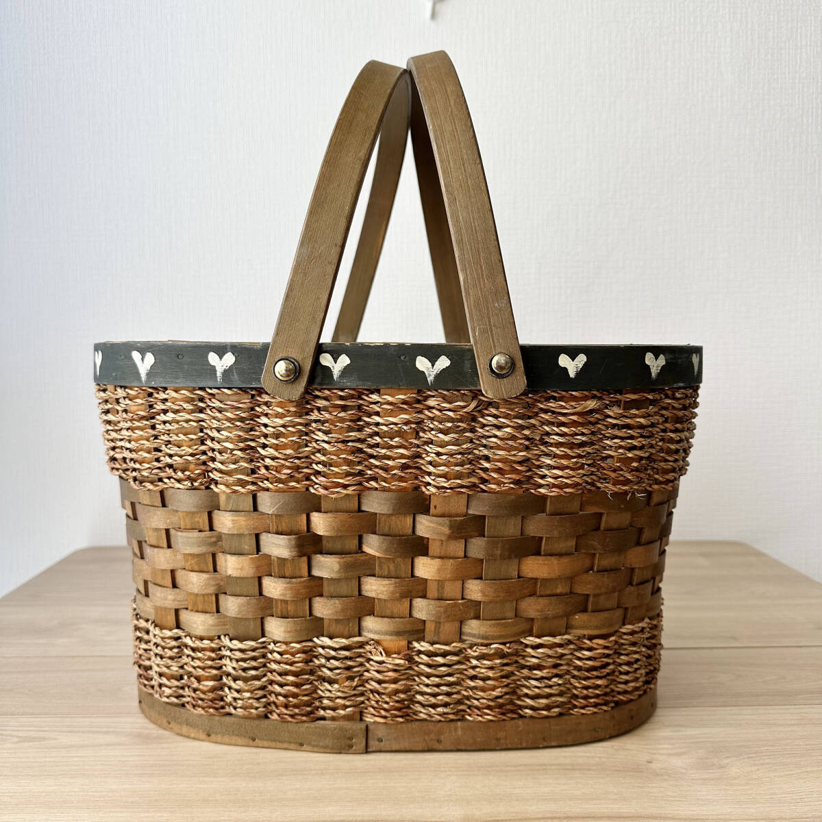 > N1226a ヴィンテージ WOOD バスケット かご バッグ 持ち手付 編み込み アメリカン雑貨 アメリカンカントリー