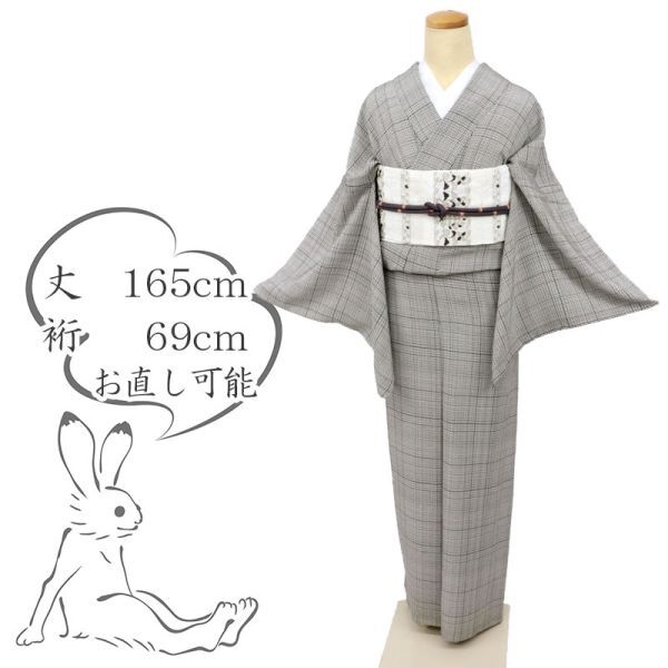 > 【小紋】 長尺 単衣 シンプル大小格子チェック柄 濃淡グレー 正絹着物 KB4-45
