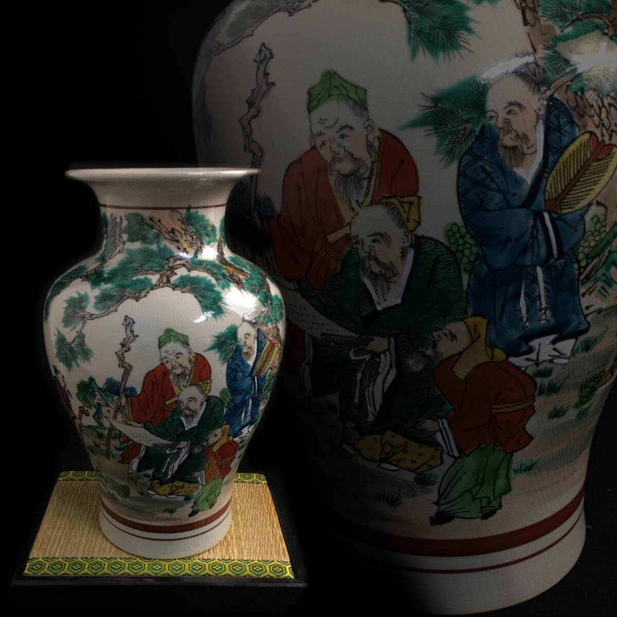 > FNY27/20 九谷焼 園山作 花瓶 金彩色絵 手書き 唐人 巻物 人物図 高さ31㎝ 伝統工芸 陶芸 花器 花瓶 花生 インテリア 畳台付き 箱付き◇