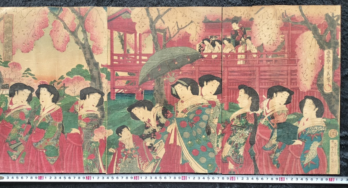- 明治期/真作 豊原周義「上野桜花遊覧図」本物浮世絵木版画 美人画 開化絵 錦絵 大判 三枚続き 裏打ち