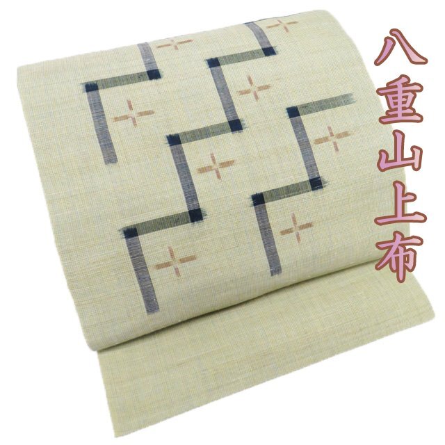 - 特選 夏物 夏帯 八重山上布 名古屋帯 なごや帯 中古 リサイクル 苧麻 カジュアル 仕立て上がり 絣模様 若葉色 多色 きもの北條 A1227-20