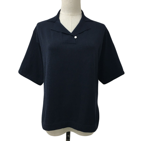 > ヒューマンウーマン HUMAN WOMAN セーター ニット プルオーバー オープンカラー リネン混 無地 五分袖 M 紺 ネイビー レディース