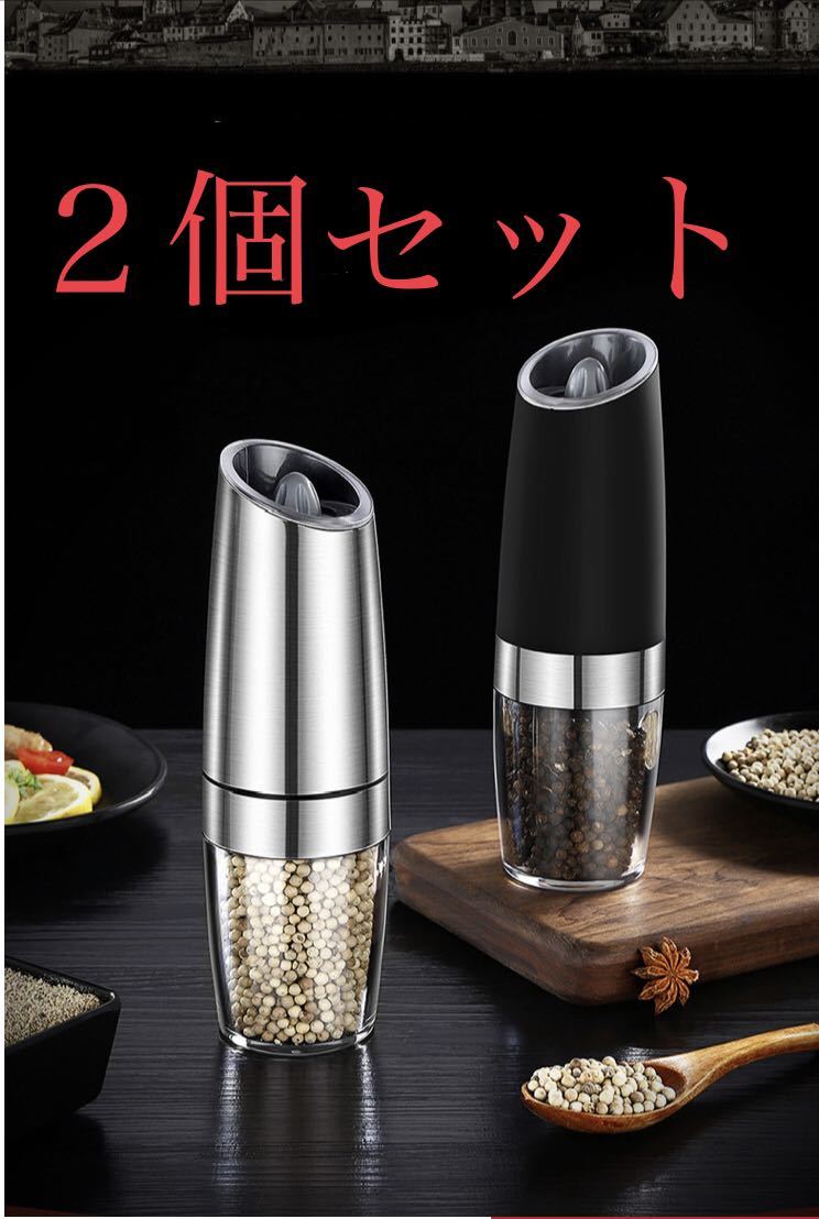 > ペッパーミル LEDライト付 電動ミル 電動ペッパーミル ソルト 調味料 コショウ 塩 調理器具 ペッパー キッチン 黒&シルバー2個セット 74