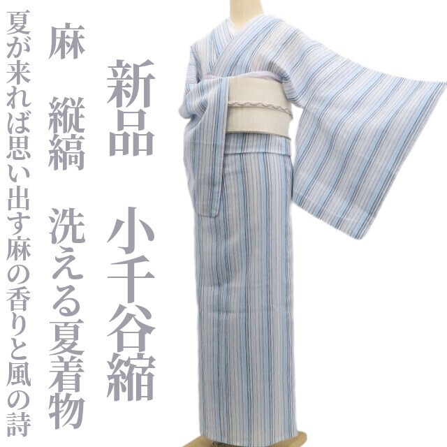 > tomihisa 新品 麻 縦縞 洗える夏着物“夏が来れば思い出す麻の香りと風の詩”仕付け糸付 小千谷縮 6196