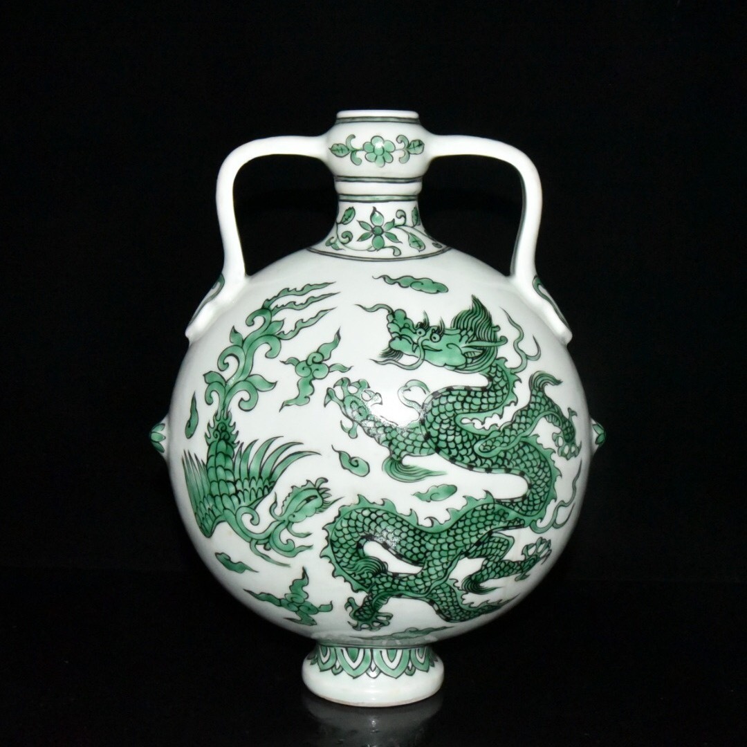 - 【超珍館蔵】明 永樂年製款 古陶瓷品 綠彩 龍鳳紋 扁瓶 陶藝 古賞物 古董品 古美術品 時代物 旧家蔵出 稀少珍蔵品