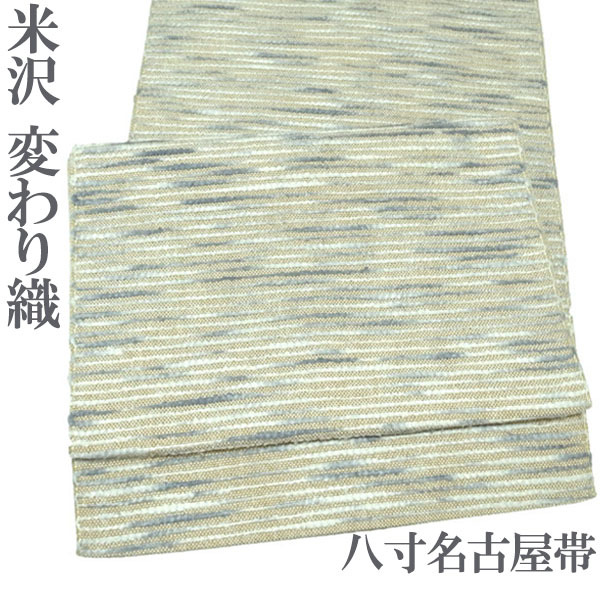 > 名古屋帯 八寸 米沢 米澤 変わり織 ベージュ グレー 灰色 灰 霞 カジュアル 普段着 小紋 春秋冬 正絹 絹 なごみ 中古 仕立て上がり kp2043