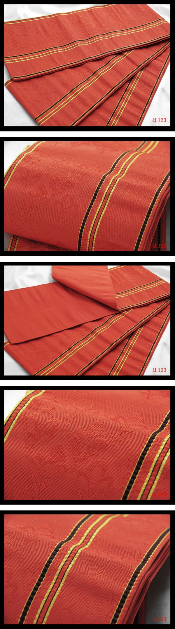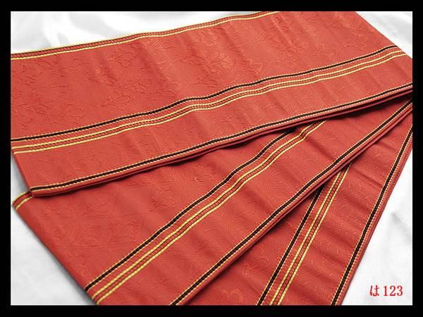 > 【は123】厳選逸品 半幅帯 本場筑前博多織 小袋帯浴衣帯 菱取草花紋 赤橙色地 正絹 ◇検◇着物簪袋帯名古屋帯和装小物帯締め