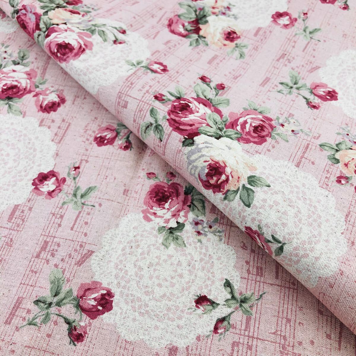 - 1m 綿麻キャンバス ローズ柄 110×100 ピンク ドイリーレース コットンリネンキャンバス 音符 生地 ハギレ 薔薇