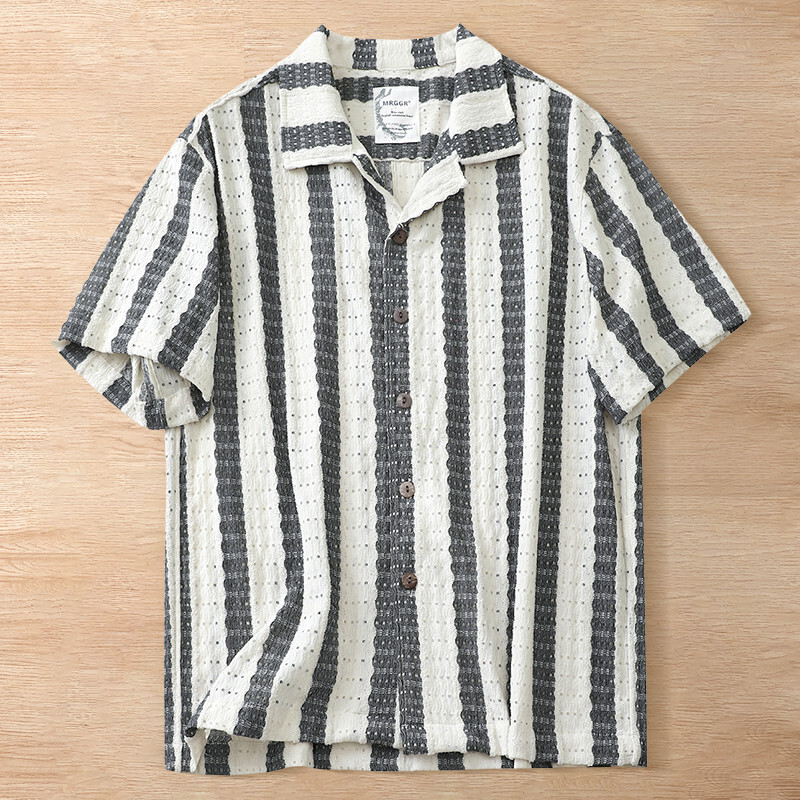 > T8800-L 新品 ジャカード 編み ストライプ メッシュ サマー シャツ 通気性 速乾 メンズ 半袖 清涼感 盛夏 開襟 オープンカラー シャツ