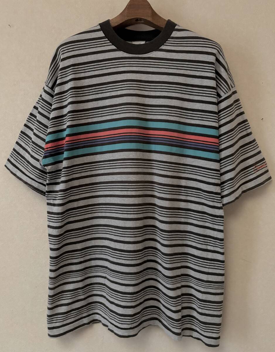- USA製90sオールドOP/Ocean PacificボーダーTシャツLグレー黒ランダム柄マルチ裾袖シングル刺繍ロゴUS製90年代サーフ系ビンテージ(hang ten