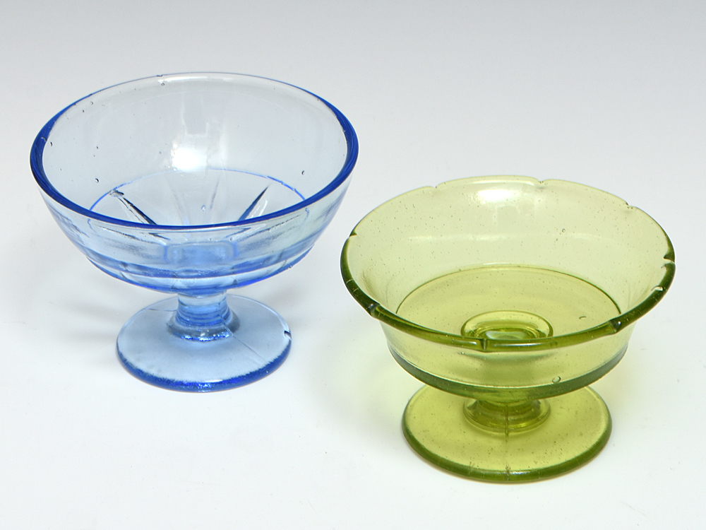 - 時代 レトロ プレスガラス 氷カップ 一対 ブルー イエロー 大正 昭和初期 ガラス工芸 現代工芸 u0556o