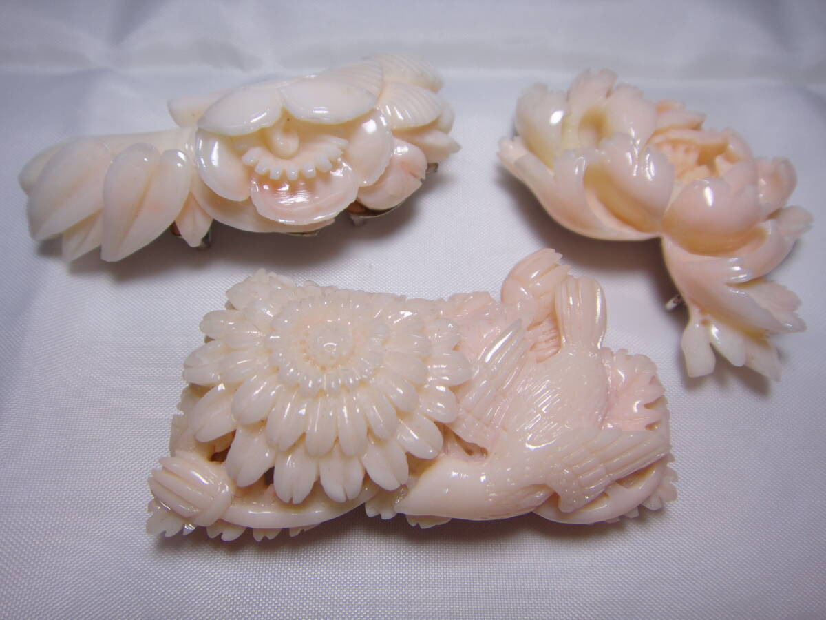 - 本珊瑚 サンゴ さんご 帯留め 菊 鳥 松 お花 Bigサイズ! 繊細彫刻 3点おまとめ 約280.55ct 良品 レトロ ヴィンテージ Y692