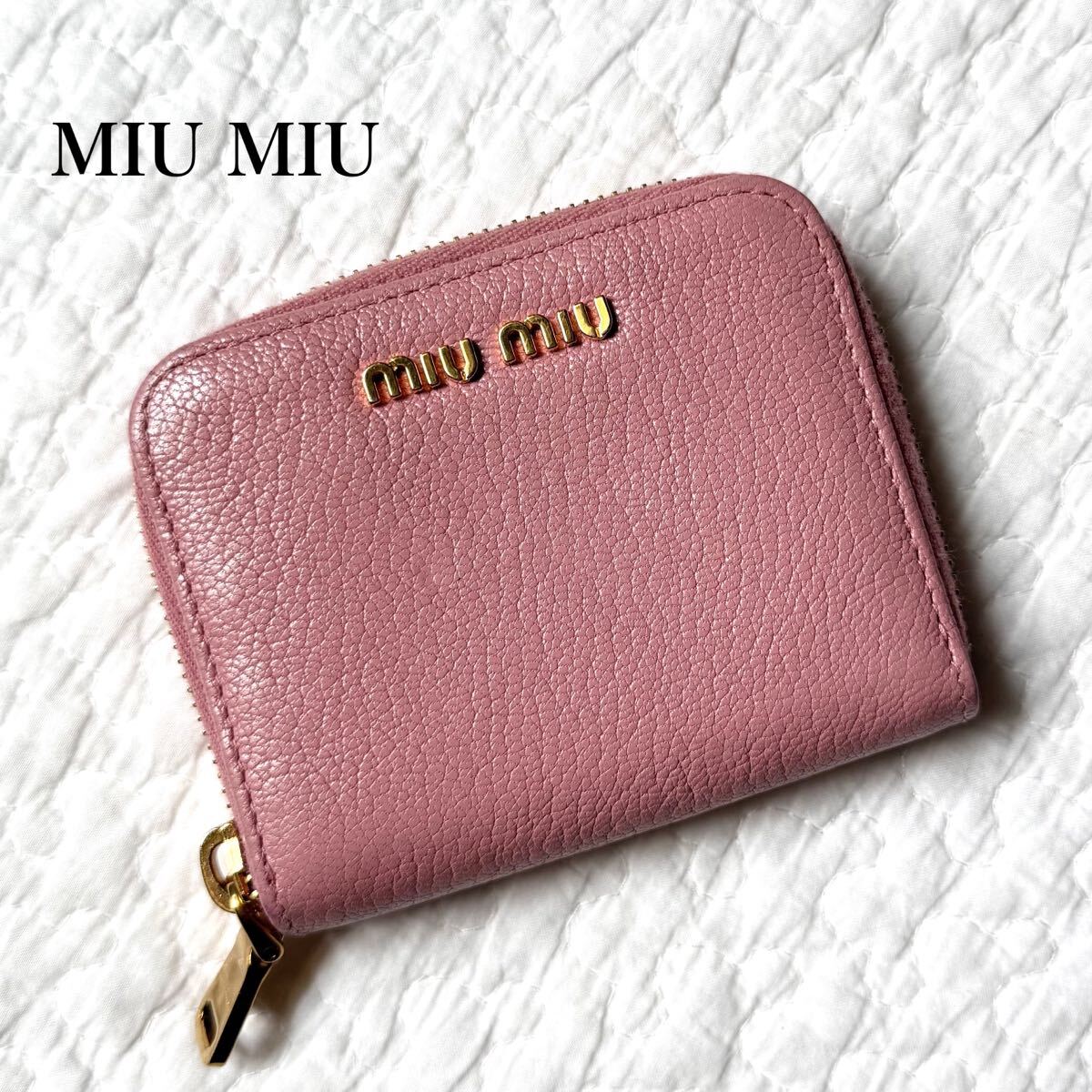 > MIU MIU ミュウミュウ マドラスレザー ラウンドファスナー コインケース ピンク ゴールド金具 ロゴ コンパクトウォレット ブランド 高級